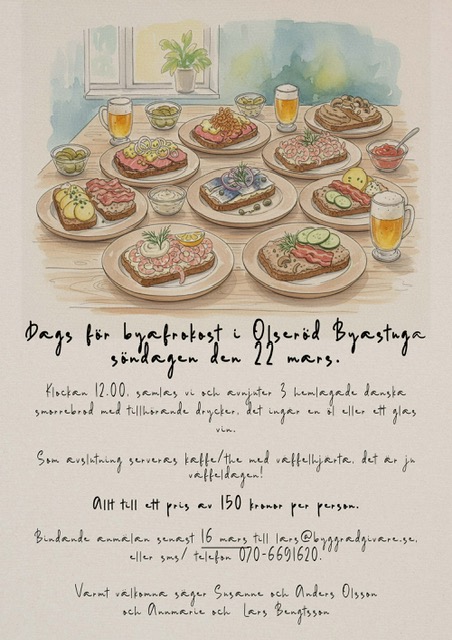 Söndag 22 mars kl 12.00. Byafrokost i Olseröds Byastuga.
